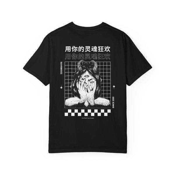 This black graphic tee features a bold monochrome illustration and stylized Chinese text for a modern streetwear look. Made from 90% soft cotton, it delivers breathable comfort and a premium feel, perfect for everyday wear or statement outfits.