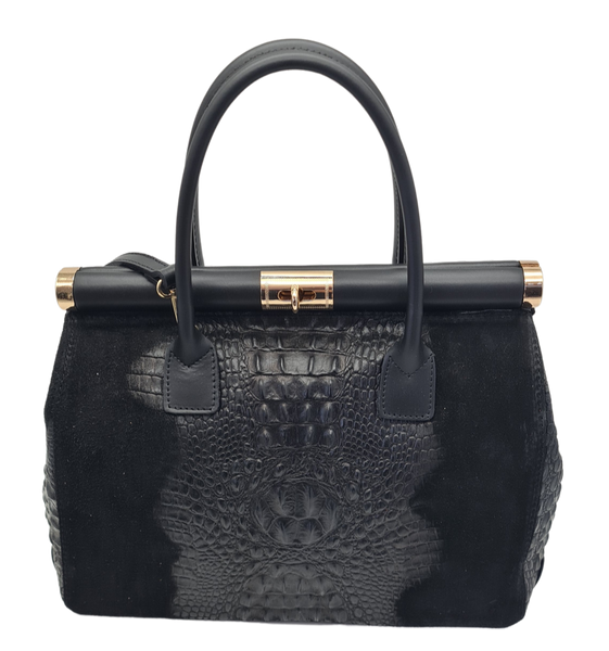 Black textured handbag with gold accents